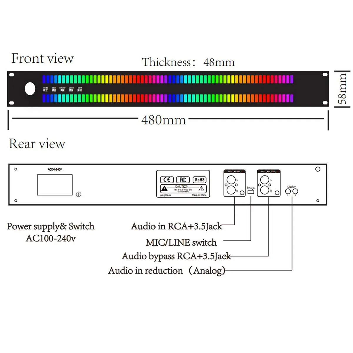 This device adopts digital processing technology and is equipped with an ARM 32-bit Cortex-M3 core CPU to drive 128 full color LEDs for dynamic display of music and sound fields. Built-in noise reduction processing, gain adjustment of input and output, support for switching between MIC input and line input, and support for switching mode, color, brightness, speed, and