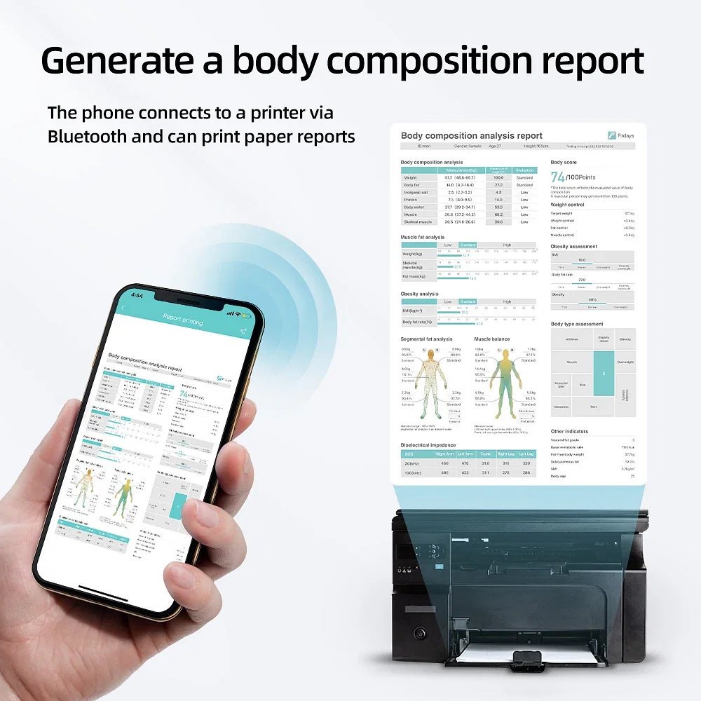 The phone connects to a printer via Bluetooth and can print paper reports