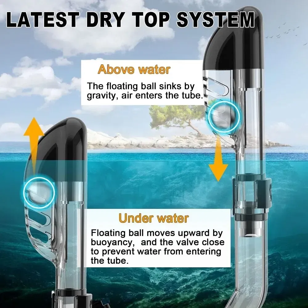 The upgraded snorkeling mask features a fully dry snorkeling system, which reduces the length of the snorkeling tube and increases the diameter to allow faster exhaust and better breathing. With the movable float ball design, it can effectively prevent water from flowing into the top, which eliminates the possibility of water entering the breathing tube to prevent choking, it allows you to enjoy snorkeling, free diving or swimming.