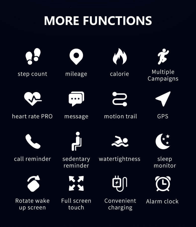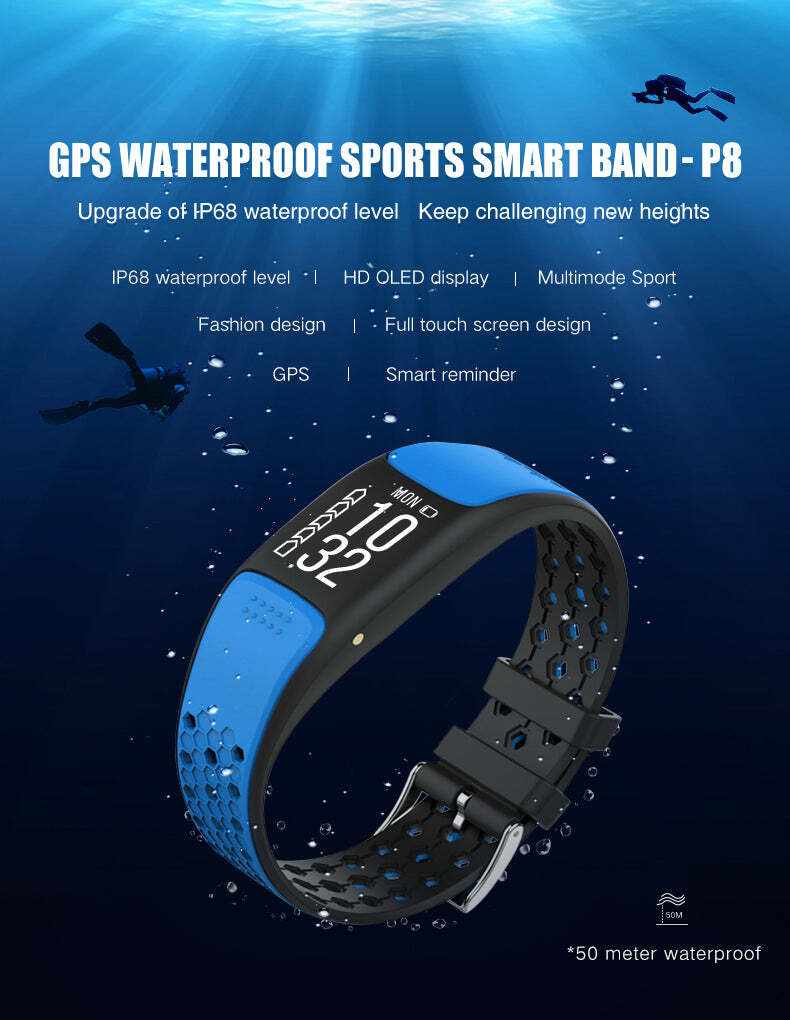 The Smart Fit Sporty fitness band is a complete multi-sports activity tracker health monitoring system. Track your blood pressure, heart rate, sleep quality, calorie expenditure, and receive alerts when you’ve been sitting for too long, or when it’s time for medication. Wear it while you walk or run to count your steps and track your distance. (All information can be accessed on your Smartphone via a free APP for all Apple and Android devices.)  Multi Sports set the watch to track the sports you are playing and it is programmed to count your activity based on the sports and calculate your Kcal burned and HR and BP based on the activity of that sports.   New technology gives you a more accurate reading and sees how you are doing. Fully waterproof (wear it in the pool!), the Sporty GPS Swimming Tracker is as durable as it is attractive. Backed by a 6-month limited warranty. It keeps Track of How many laps you swim and distance via GPS connected thru the APP Swimming Mode  Cycling Mode Climbing Mode Running Mode Walking ModeBesides that, it keeps track of your Heart Rate and Blood Pressure too in Active Mode.Blood oxygen monitor Active heart rate monitor Multi Sports Activity Tracker. Step monitor and odometer Sleep monitor Call alert with caller ID Calorie counter Ultra-bright OLED screen with vertical and horizontal layouts Touchscreen Gesture control Dual-color heat-bonded TPU silicone band IP67 waterproof rating Remote control for your smartphone’s camera Fully compatible with Apple devices using iOS 4.5 and above, and Android devices 4.35 and above Syncs with your smartphone via a free app available in the iTunes or Google Play store